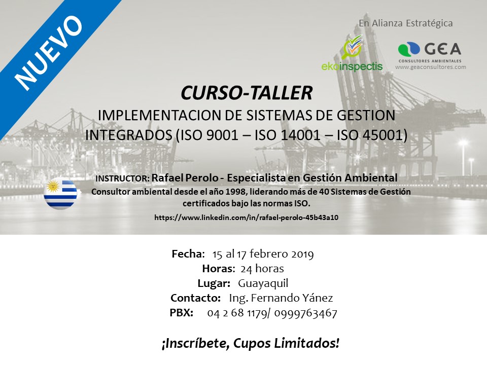 El próximo mes de febrero estaremos dictando un Curso-Taller de "Implementación de Sistemas de Gestión Integrados (ISO 9001 - ISO 14001 - ISO 45001)" en la ciudad de Guayaquil, Ecuador, en el marco de nuestra alianza estratégica con Ekoinspectis (http://ekopraxis.com.ec/ekoinspectis-cia-ltda/).